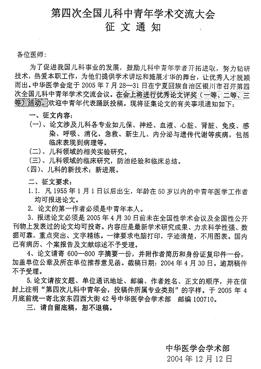 第四届全国儿科中青年学术交流大会征文即将结束。请全体医技人员积极投稿。