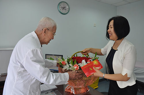 上午9点,韦书记手捧鲜花,来到我院6层特需门诊,看望正在那里出门诊的张金哲院士。在出诊间歇,韦书记与张院士亲切交谈,关切地询问院士的身体和工作情况,向院士介绍了医管局的近期工作,叮嘱院士要保重好身体。张院士感谢医管局领导的关心,并风趣地表示:要好好地活着,还等着到新建的血液肿瘤大楼出门诊呢!
