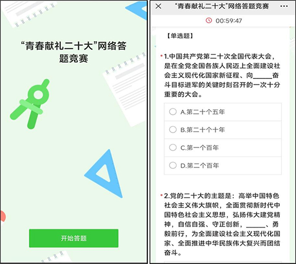 为贯彻落实“学习二十大、永远跟党走、奋进新征程”主题教育实践活动要求,根据院团委和教育党总支要求,教育团总支积极开展“青春正当时”团组织品牌建设工作,组织学生团员青年认真学习党的二十大精神,并举办“青春献礼二十大”网络答题竞赛。