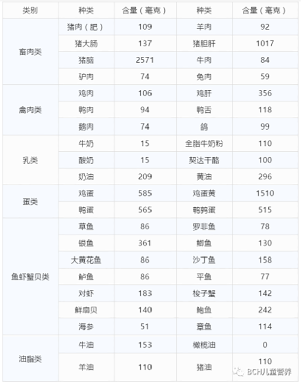 提到限制胆固醇,大家首先想到鸡蛋。鸡蛋及其他蛋类胆固醇含量缺失比较多。一个鸡蛋约50g,蛋黄中胆固醇含量约292mg,所以一个蛋黄就满足了一天的胆固醇限制。所以对于高胆固醇血症儿童,可以每天吃至少1个蛋清(优质蛋白质且无脂),加1/3-1/2个蛋黄。
