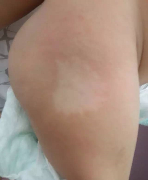 近日我在出门诊,遇到一对父母,一见面,就着急地说突然发现小宝宝身上出现了一块白斑(如下图),急坏了,问是不是白癜风。经过检查后,我告诉家长这个小宝宝得的不是白癜风,而是无色素痣