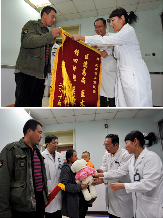 院领导始终重视和关心小宣的病情,出院时,赵成松院长助理及医务处陈晖副处长、王辉副处长和客户服务部闫春梅主任等代表医院到病房看望小宣。为了表达对医院成功救治小宣的感激之情,小宣父亲向医院赠送了一面写有“医德高尚,医术精湛,精心护理,关怀备至”的锦旗,赵成松院长助理代表医院接受锦旗,并和基础外科张廷冲主任一起为小宣送上了爱心布娃娃。她说,祝愿小宣能在父母的精心照料下,健康成长!张廷冲主任嘱咐家长,针形异物取出后,伤口会很快愈合,对以后生活影响不大。小宣出院后,需要注意的是预防粘连性肠梗阻,不能暴饮暴食。