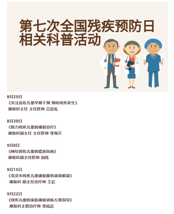 从8月25日开始,北京儿童医院康复科公众号计划每周发布残疾预防相关科普讲座视频,推送残疾预防知识。第一期科普内容由康复科主任吕忠礼为大家讲解了《关注高危儿早期干预 预防残疾发生》;后续还将就智力残疾儿童的康复治疗、神经损伤儿童的喂养指导、北京市残疾儿童康复服务政策解读、残疾儿童的家庭康复训练方案指导等残疾预防、儿童康复领域热点问题进行科普宣教,加强残疾预防政策和知识宣传,创建关心关爱残疾儿童的社会氛围。