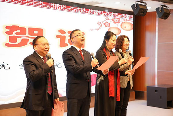 第一篇章,院领导们首先代表全院职工给离退休老同志拜年,恭祝大家新春愉快,阖家幸福,龙年大吉!