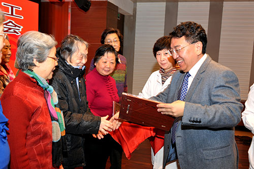 团拜会上,退休支部书记王金芳同志宣布了2014年度“五好家庭”和“健康老人”的获选名单。王天有书记、丁枭伟副书记向倪桂臣、陈幼容等24名获奖的老同志颁发了证书和奖品。