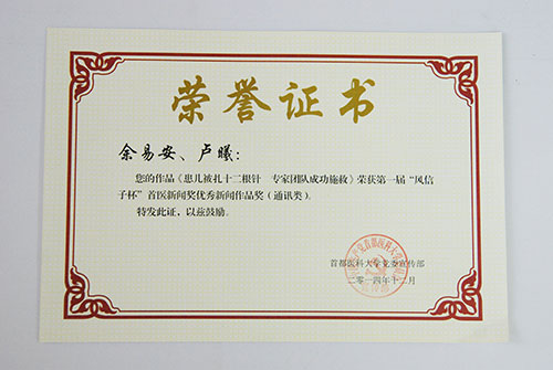 1月21日,首都医科大学2014宣传思想工作年会暨职业道德建设学术研讨会召开,会议为首届“风信子杯”首医新闻奖获奖者举行了颁奖仪式,我院获得首届 “风信子杯”首医新闻奖优秀新闻稿件报送单位称号,宣传中心余易安、卢曦撰写的《患儿被扎十二根钢针 专家团队成功施救》获得通讯类优秀新闻作品奖。