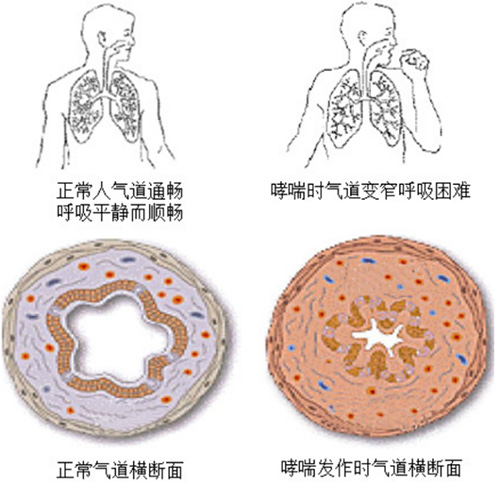 呼吸道由鼻、咽喉、气管、支气管、细支气管、毛细支气管和肺组成,就像一棵倒立大树的分枝一样,从上至下,从主干到侧支,逐级分支变得越来越多,直径也变得越来越细。在正常情况下,整个气道非常通畅,气体很容易进出。而哮喘患者的气道由于炎症病变,造成气道壁肿胀、黏液分泌增加、平滑肌收缩,从而使整个气道腔变得狭窄,导致气道空气流通受到阻碍和限制。哮喘的慢性炎症会使整个气道都受到影响,但最主要的发病部位是细支气管。