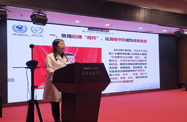 张海鸥以《以党纪“戒尺”校正言行,以信念之“火”铸就忠诚》为题从三方面进行了讲解:一是常用纪律“戒尺”,让遵规守纪成为高度自觉。结合习近平总书记关于全面加强党的纪律建设论述和《中国共产党纪律处分条例》规定,强调党员医务工作者要遵守政治纪律,始终做政治上的明白人;遵守组织纪律,牢记第一身份第一职责;遵守廉洁纪律,坚持廉洁从业、秉公用权;遵守群众纪律,让管理和服务对象有更多获得感;遵守工作纪律,既不消极怠惰也不任意妄为;遵守生活纪律,既美好生活又遵规守纪。二是常敲思想“警钟”,让敬畏纪法浸入心脑言行。对部分发生在医疗卫生系统和北京市的反面典型案例进行深入剖析,从算好政治账、经济账、名誉账、家庭账、自由账等角度要求大家受警醒、明底线、知敬畏,指出:“人生是一场长跑!只有廉洁自律、清风护航,才能安全到达终点”。三是常燃信念之“火”,让初心使命代代接续绽放。从反思为什么入党、入党后如何为党工作切入,共同学习杰出女革命家曾志同志为了党和国家利益“可以舍弃一切”的光辉一生,在诵读两封家书中感受“不言身与家”的无限忠诚与廉洁风范。