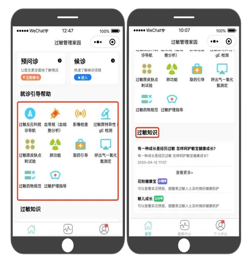 小程序“健康中心”模块,提供了居家管理功能,您可以记录宝贝的过敏史、用药情况、肺功能检测记录、急性过敏发作事件等过敏健康检测结果,系统会推送按时用药提醒、过敏原风险环境提醒、过敏急性发作事件应急处理意见、非过敏性疾病的防护指导建议。