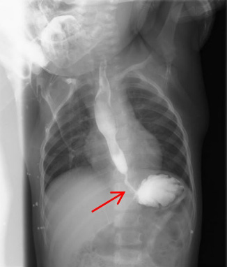 图1:先天性食管狭窄患儿的消化道造影检查。红色箭头:食管狭窄段。