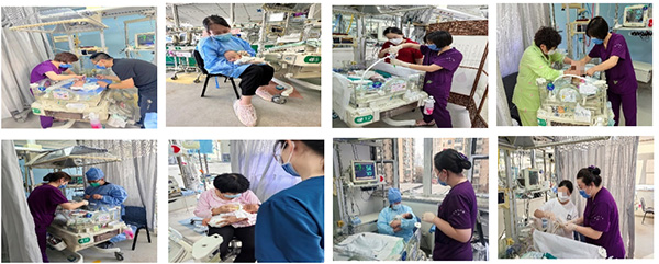 新生儿中心收治来自全国各地的危重患儿,除早产儿外,许多先天性疾病如食道闭锁、遗传代谢病、坏死性小肠结肠炎的患儿,在出院后,对患儿家属照护技能具有较高的要求。为了提升患儿的居家护理质量,新生儿中心积极联系家长,在拥挤的病房内创造条件安装隔帘,为家长营造小小的私密空间,供家长实施袋鼠式护理、协助妈妈们实施母乳亲喂……2024年新生儿科已开展了69例次。除了生活护理与发育支持以外,涉及覆盖的专业知识还有体位管理、造瘘袋更换、家庭氧疗、管饲重力喂养等多个方面,促进医院家庭过渡期的护理安全。