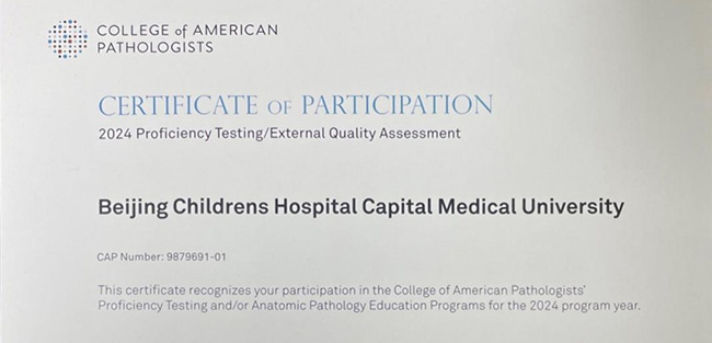北京儿童医院病理科首次参加2024年度美国病理学家协会(CAP)认证,分别于2024年12月、2025年2月完成两项室间质评——肿瘤细胞突变高通量测序检测和RNA融合基因高通量测序检测,并以满分通过。