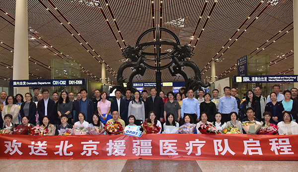 2025年5月20日清晨,北京儿童医院心脏超声科主任医师张红菊随北京市第十一批第三期援疆医疗队奔赴新疆和田,对口支援和田县人民医院,开展为期一年的医疗援助工作。北京市卫生健康委员会党委委员、副主任王建辉等领导前往送行。院党委专职副书记张海鸥,心脏学科党支部书记、心脏超声科主任马宁,心脏学科党支部组织委员、心脏超声科副主任张鑫,党委办公室副主任宫小飞、宣传中心工作人员及援疆干部家属等到机场送行。