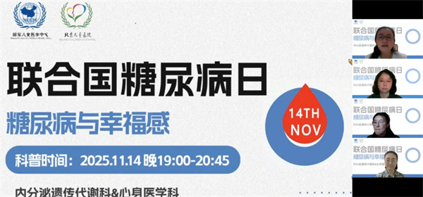 11月14日是联合国糖尿病日,北京儿童医院内分泌遗传代谢科和心身医学科以“糖尿病与幸福感”为主题,联合举办了一场精彩的线上科普直播,助力家长解锁科学控糖与守护孩子幸福童年的双重密码,吸引了众多患儿家庭、儿科医护人员及教育工作者参与,医院平台播放量1.2万人次。
