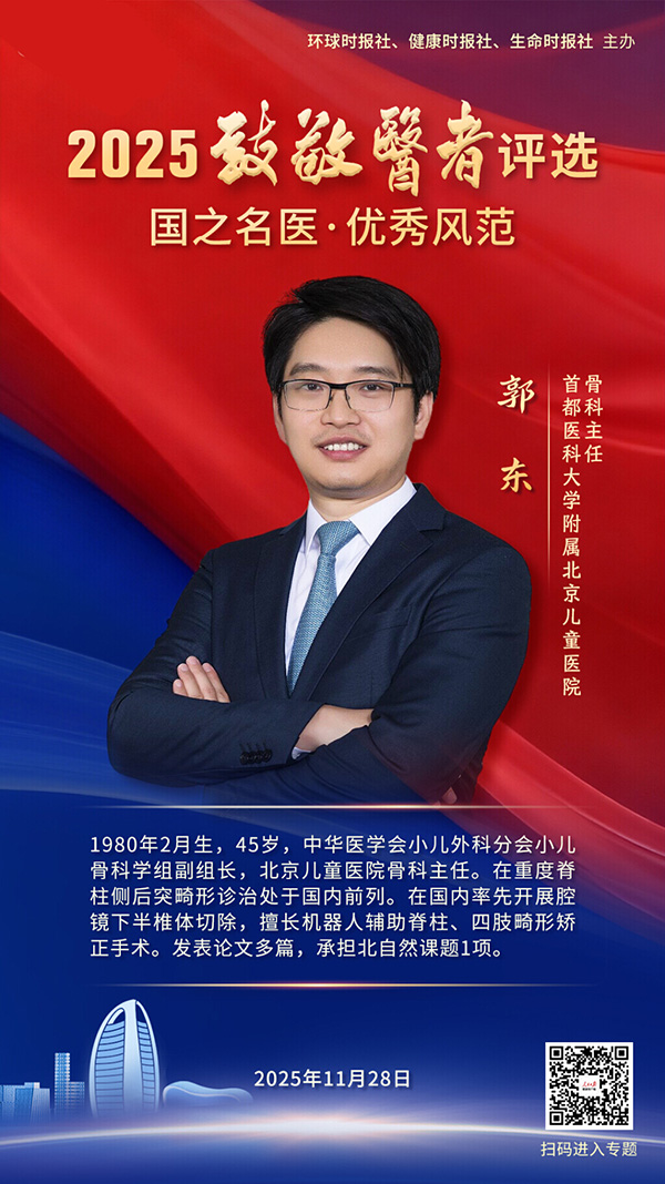 在儿童脊柱畸形诊疗领域,北京儿童医院骨科主任郭东是无数患病家庭的 “定心丸”。45 岁的他身兼中华医学会小儿外科分会小儿骨科学组副组长,手握医学博士学位与主任医师职称,以精湛医术与柔软仁心,为孩子们撑起一片健康蓝天。