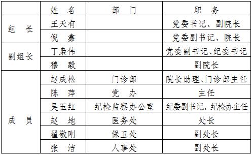 医院成立专项工作领导小组和工作小组。由医务处、门诊部、党办及纪检办负责组织和协调工作,由各临床科室主任(主持工作副主任)完善日常监督管理工作。