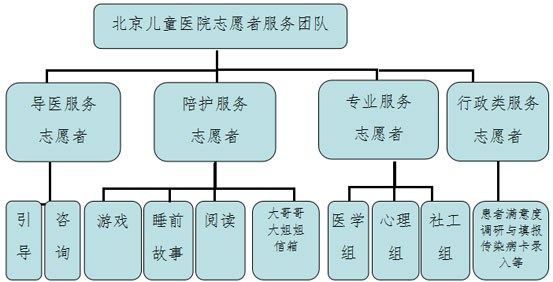 为保障北京儿童医院志愿服务的良性运行,推进志愿服务工作,由北京儿童医院党委牵头建立北京儿童医院志愿服务工作部(以下简称工作部),负责志愿者的招募与选拔、岗位设计与匹配、志愿者培训与激励、志愿服务效果的评估等工作。