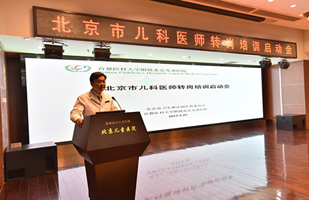 会议上,郑晋普委员致开幕词。他指出,目前北京市服务于儿童的医疗卫生资源存在绝对不足和相对不足两方面。绝对不足体现在每千人儿科医师数量远低于欧美发达国家;相对不足体现在北京儿童医院承担了全国儿科疑难病例的诊治。解决这一难题的有效方法之一就是使更多临床医师加入服务儿科的行列。他希望儿科医师转岗培训学员通过在临床培训基地为期一年的培训,既要完成相应的培训课程,又要达到专业技能标准,同时还要树立良好的医德医风,养成良好的职业素养,充实到儿科医师队伍中。