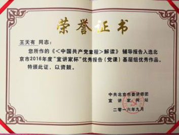 在北京市2016年度“宣讲家杯”优秀报告(党课)评选中,北京儿童医院王天有书记和倪鑫院长的党课被评为基层优秀作品。“宣讲家杯”优秀报告(党课)评选活动是由北京市市委讲师团、市宣讲家网站主办的。2016年度,北京市卫生计生系统共有3部党课被评为基层优秀作品。