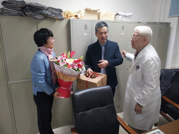 11月3日早晨,北京儿童医院党委副书记、纪委书记丁枭伟,工会主席王爱华带领工会专职干部手捧鲜花、生日蛋糕来到潘少川教授的办公室,为潘少川教授庆祝91周岁生日。丁枭伟副书记代表全院职工衷心地祝愿潘教授生日快乐,健康长寿!
