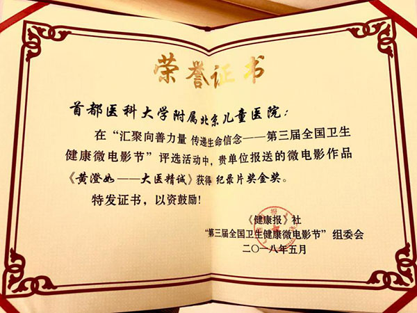 5月26日晚,由《健康报》社和河南省卫生计生委共同主办、郑州市卫生计生委承办的“汇聚向善力量,传递生命信念——第三届全国卫生健康微电影节”颁奖晚会在河南省郑州市举行。北京儿童医院报送的微电影作品《黄澄如——大医精诚》荣获此次电影节最佳纪录片奖金奖、最佳制作奖银奖两项大奖。