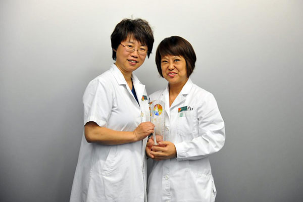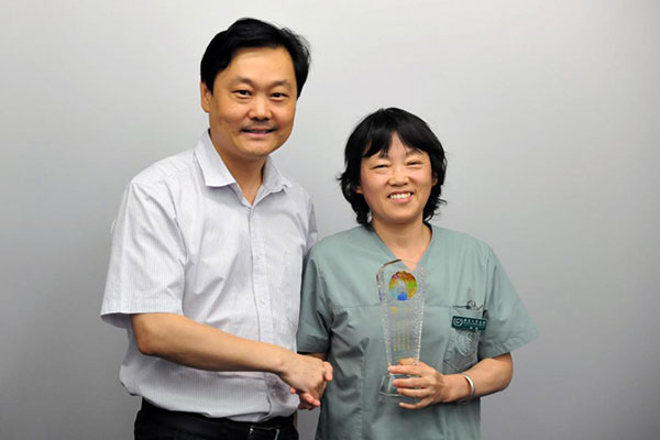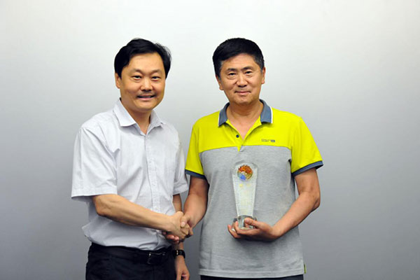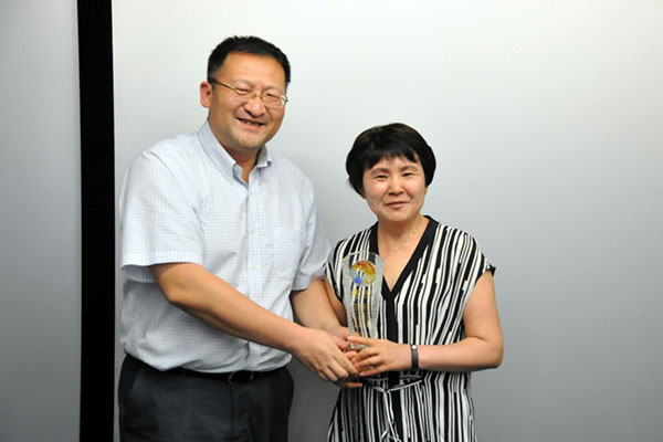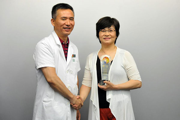 随后由丁枭伟副书记、谢向辉副院长及葛文彤副院长、王爱华主席为18名到龄退休职工分别颁发了带有北京儿童医院院标、院训及对退休职工美好祝福的纪念奖杯。