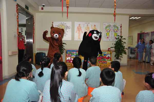 志愿者们首先换上熊本熊和轻松熊的玩偶装,在小朋友们面前跳起了欢快的舞蹈,一扫病房内紧张的气氛,拉近了与小朋友之间的距离。