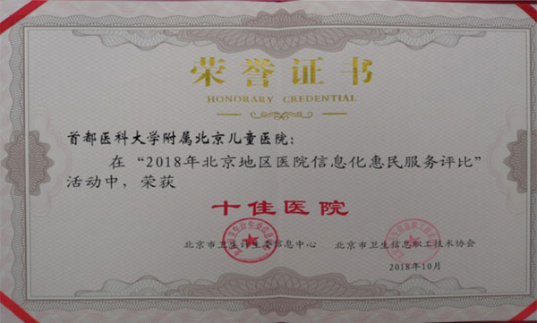 北京儿童医院荣获“2018年北京地区医院信息化惠民服务”十佳医院称号