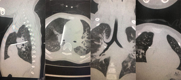 后续检查进一步显示,孩子胸腔内有一根疑似钢针的异物,孩子年龄小,异物长,针尖朝着心脏的方向,紧挨大血管和气管。心脏在跳动,肺部也随着呼吸在动,稍稍一个体位的变化或者深呼吸,都有可能造成针的移动,随时都有扎破血管的风险,后果不堪设想。