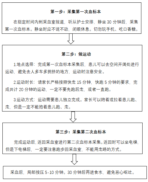 2.警惕患儿发生低血糖。低血糖的主要症状表现为面色苍白、嘴唇发白、出虚汗、蹲下不肯再跑等。出现这些情况,请家长将孩子抱回并让护士甄别,此次是否能继续完成还是需要下次再进行实验,以及是否需要喝糖水控制低血糖等相关情况。低血糖具有一定的危险性,家长千万不要强迫孩子完成。