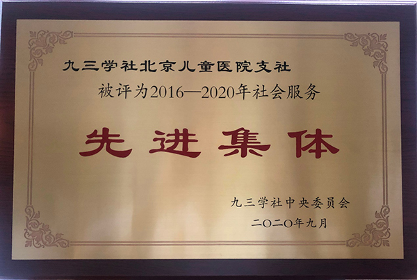 九三学社北京儿童医院支社荣获九三学社中央委员会“2016-2020年社会服务先进集体”,葛文彤副院长在新冠疫情防控工作中表现突出,被九三学社中央评为“九三学社抗击新冠肺炎疫情先进个人”,提交的建议分别被九三学社中央、全国政协每日社情采用;农工党北京儿童医院支部荣获农工党北京市委员会“2019年度先进支部”,支部书记杨学芳被评为“2019年度组织工作先进个人”,支部党员钟雁、杨学芳、孔健、王忱荣获农工党北京市委员会“2019年度优秀党员”。