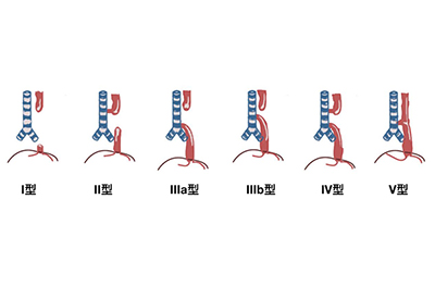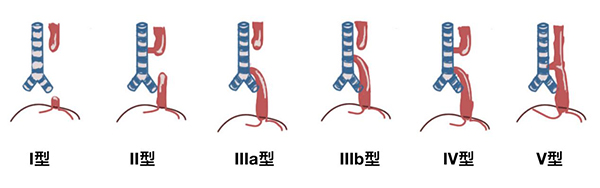 V型食管闭锁:这一型并不是真正意义上的食管闭锁,只在气管和食管之间存在一个单纯的气管食管瘘,食管并没有断开。孩子在出生后通常可以正常喂养,但偶尔会出现呛奶的症状。部分孩子因为瘘管很细也可能不出现呛奶表现,所以早期很难诊断清楚。这类孩子可能会因为反复肺炎,多次住院之后可能通过气管镜检查和食管造影而被确诊。
