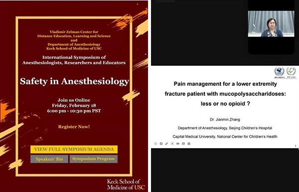 北京时间2月19日,北京儿童医院麻醉科主任张建敏受邀参加由南加州大学凯克医学院组织举办的主题为“麻醉安全( Safety in Anesthesiology )”的线上国际研讨会,与来自美、日、俄、韩、意、印、亚美尼亚等国家的16位讲者共话麻醉安全,就麻醉药理、安全、质控、疼痛管理以及新冠病人手术的麻醉管理等话题进行了深入探讨。张建敏以《一例粘多糖病合并下肢骨折患儿的疼痛管理——少阿片药物还是无阿片药物》为题介绍了北京儿童医院临床麻醉病例并参与了讨论。