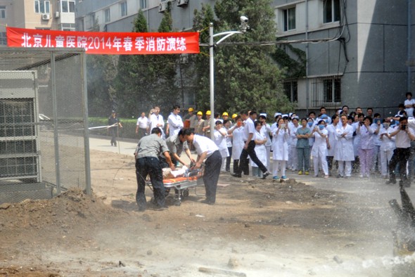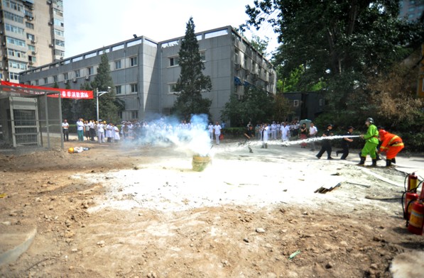 这是我院保卫处、运营保障处、医务处、护理部和北装公司多部门联合举行的2014春季消防演练,本次演练成功完成了火情报警、疏散逃生和消防灭火三项演练内容,来自全院40余个科室和病房的60余名安全员进行了观摩学习。整个演练中,人员到位迅速,职责分工明确,设备操作熟练,组织协调高效,观摩人员受益匪浅。