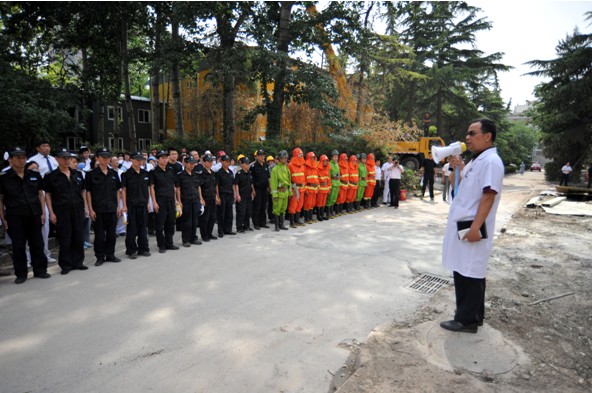“着火啦,快来救火啊”, 2014年5月23日下午行政楼前的花园工地上着起了一人多高的火苗,附近的工人边大声求助边拨通了我院保卫处和运营保障处接报中心的电话,另外几名工人取来附近为应急防火准备的干粉灭火器,站在上风口对准火源根部进行灭火,并迅速切断工地总电源,移除易燃物品,疏散现场人员撤离。同时,保卫处接报中心接到“火灾”报警后,立即通知中控室、义务消防队、治安办和保卫处办公室;运保处接报中心立即布置水电专业人员前来现场。两分钟后,义务消防队抵达,使用室外消火栓进行扑救,大火很快被扑灭。医务处和护理部组成的救护组也在第一时间抢救出了“伤员”,并对其简单处理后,送往急救楼。