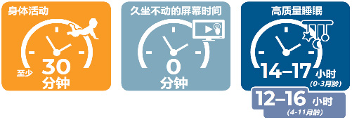不同年龄段儿童的推荐运动时间,可参照WHO的指南推荐内容(详见下图)。